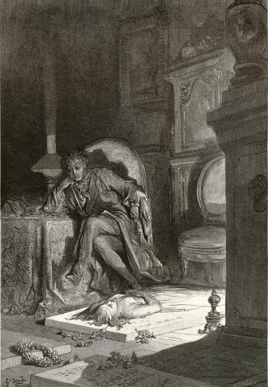 Pero como quiéra que fuéra, el ave se posó con gran porte, en el busto de Palas, que se hallaba en el dintél de su puerta, y allí se quedó, de manera quieta e inmóvil.